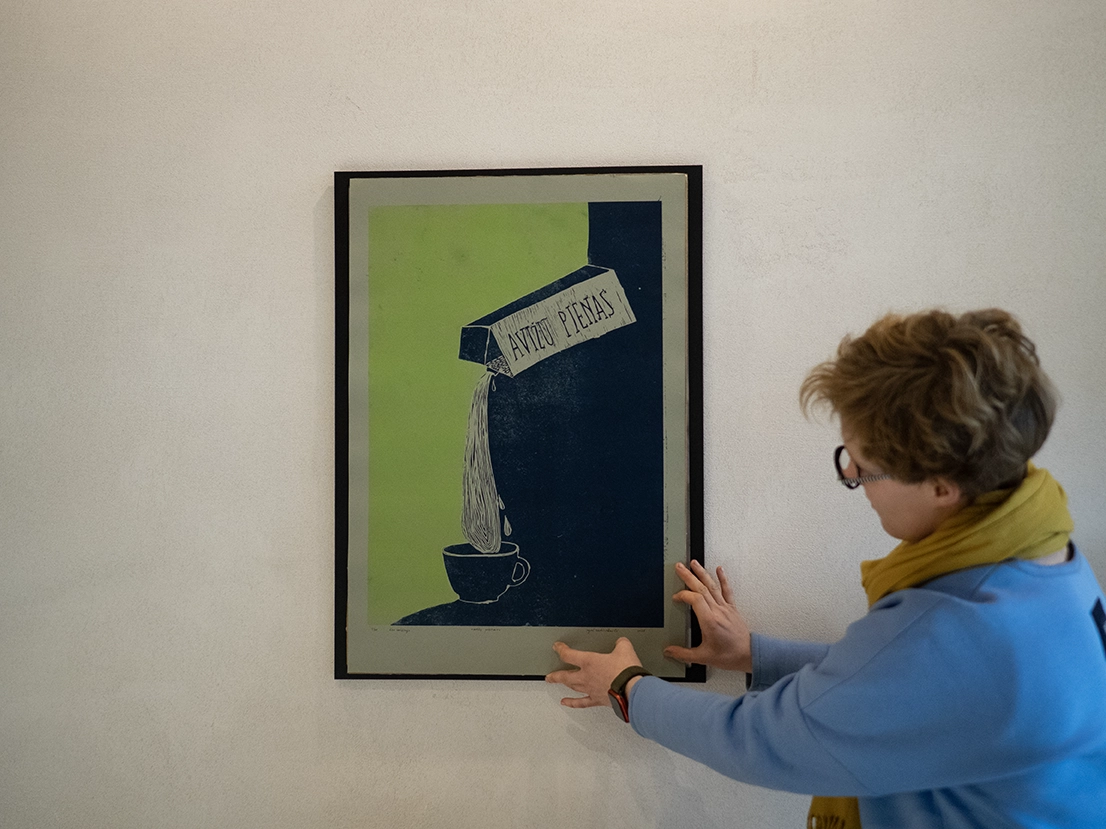 spalvotas lino raižinys. avižų pienas. 420×594 mm. 2025