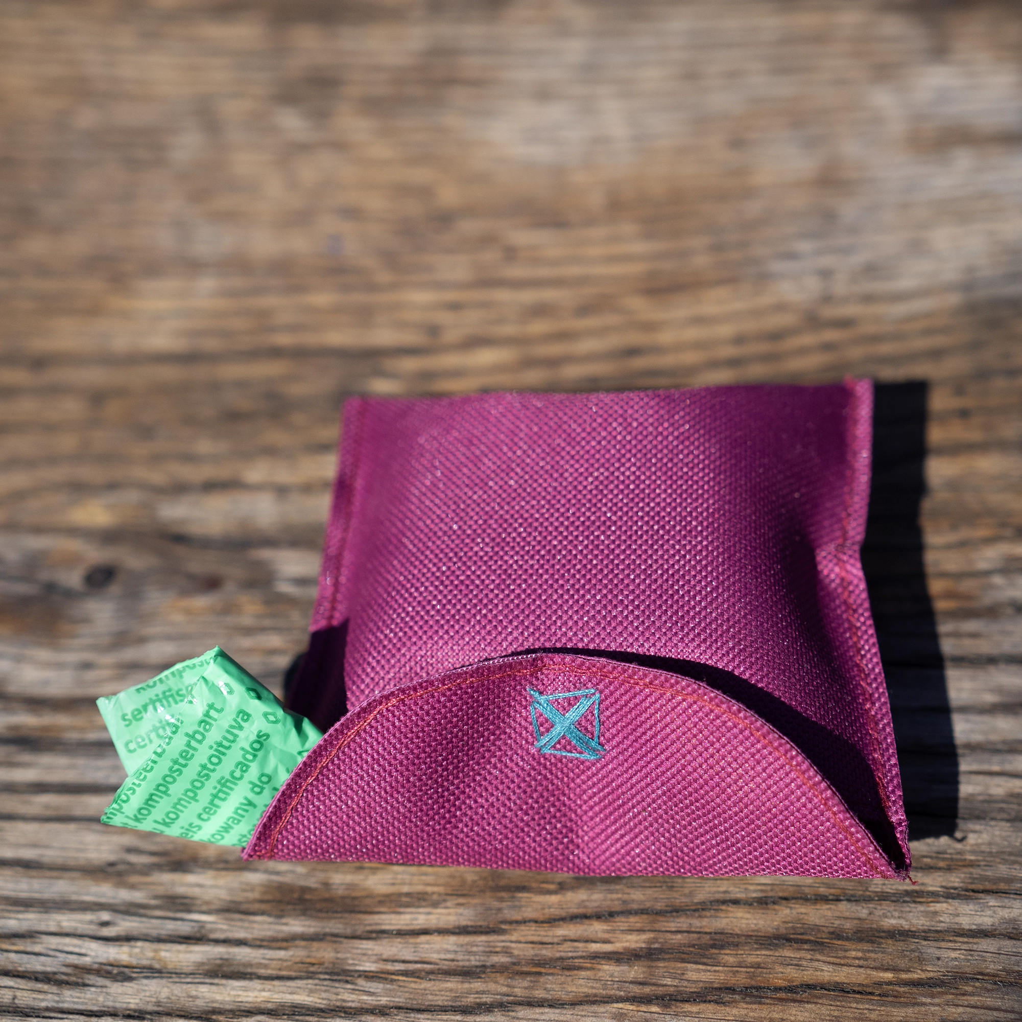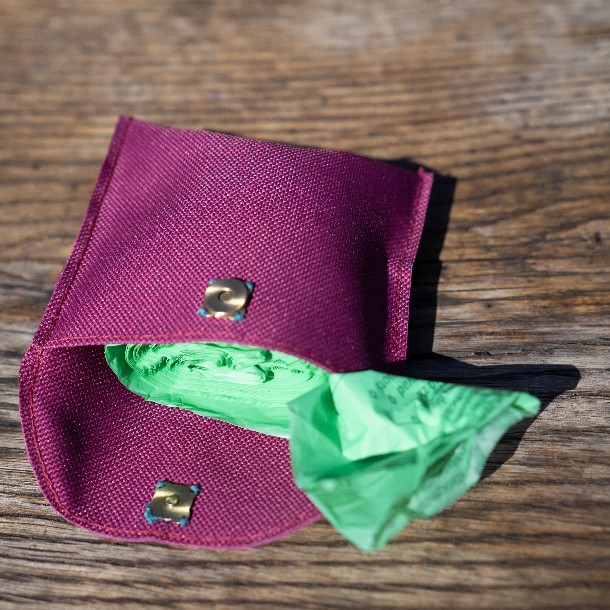 Impregnuotos medžiagos, rankų darbo dėklas šuniukų maišeliams ir skanėstams. Taip pat gali būti naudojamas kaip nedidelė piniginė ar raktinė.