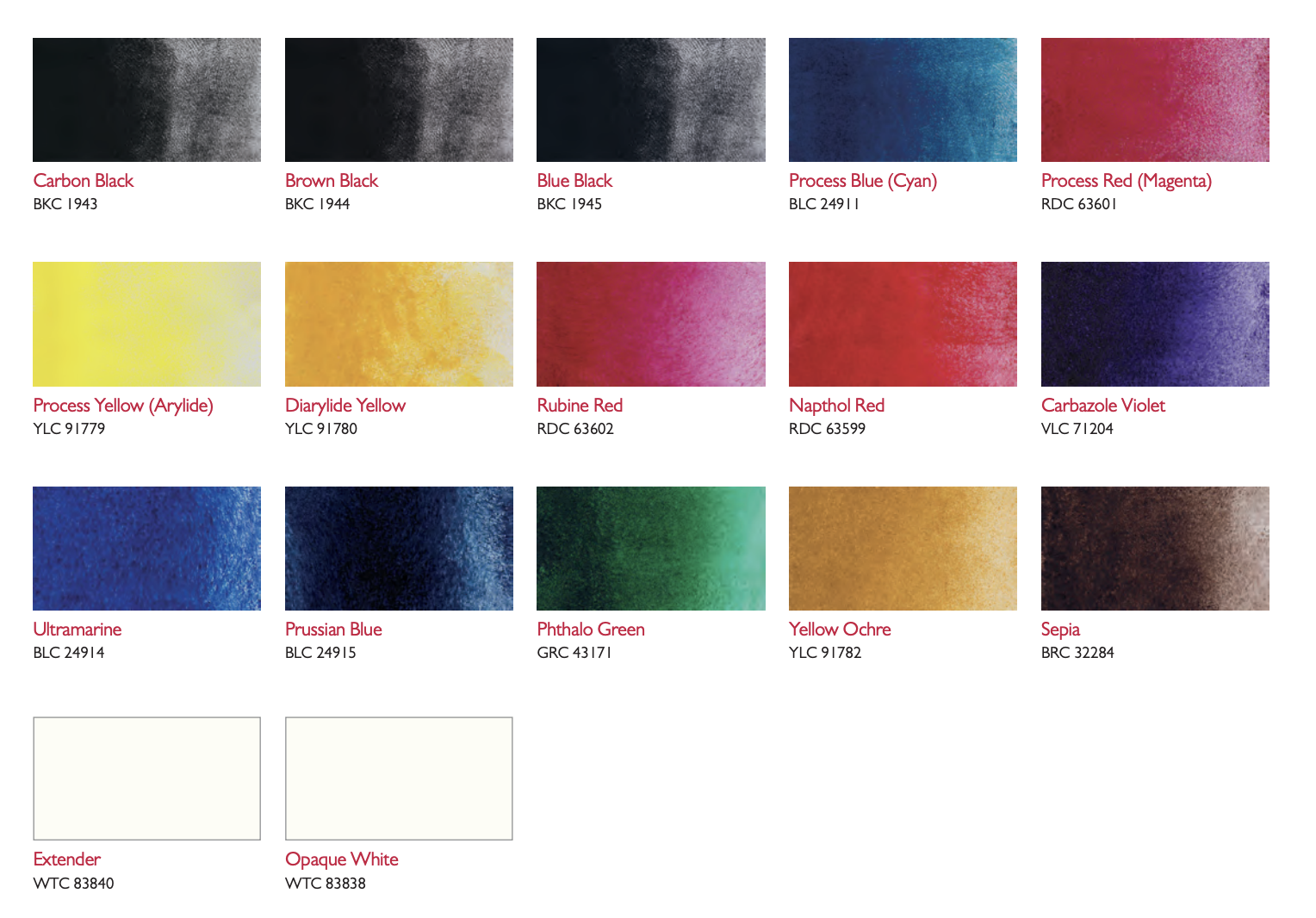 | spalva | anglies juoda, carbazole violet, cyan mėlyna, magenta raudona, mėlynai juoda, ochra, phthalo žalumas, rudai juoda, sepia, ultramarinas, arilido (hanzos) geltonasis, diarilidinis geltonasis, naftolio raudona, rubino raudona, nepermatoma balta – opaque white, phthalo mėlyna, prūsiškas (berlyno) mėlynumas, minkštiklis-extender |